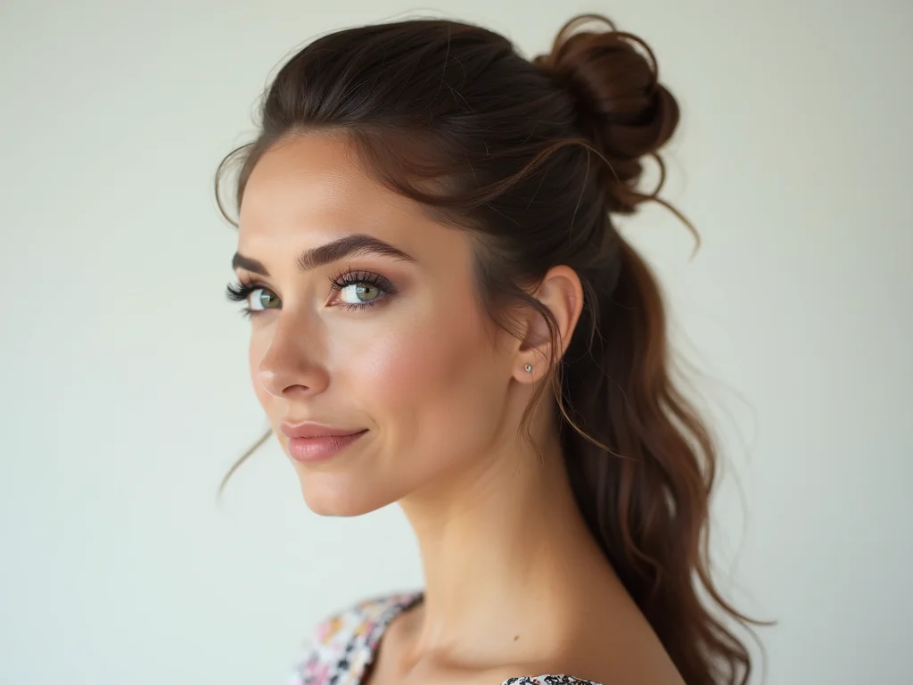 - Crie o Coque (Método Rápido): Pegue o rabo de cavalo e dê uma ou duas voltas nele mesmo, formando um coque. Deixe a ponta do cabelo solta, criando aquela vibe despojada do “half bun”. Prenda a base do coque com um elástico, passando por cima dele, ou com grampos para mais segurança.