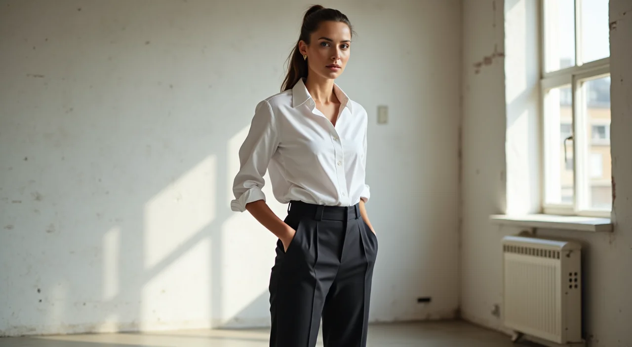 A calça cigarrete é uma aliada poderosa no guarda-roupa de trabalho. Sua modelagem ajustada e comprimento no tornozelo criam uma silhueta elegante e profissional. Para o escritório, combine-a com camisas de botão, blusas de seda, blazers bem cortados e sapatos de bico fino ou scarpins. Cores neutras como preto, cinza, marinho e bege são apostas certeiras. O segredo é manter a harmonia entre as peças e garantir um caimento impecável.