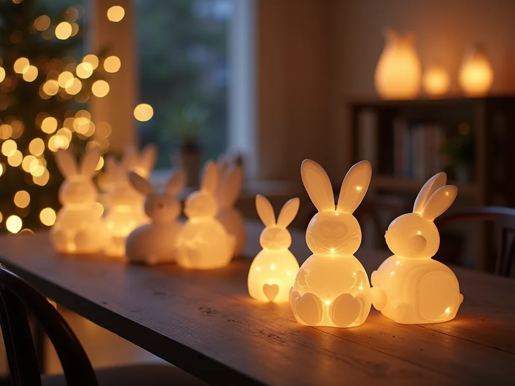 Para um toque sutil e elegante, aposte em enfeites de mesa com LED. Pequenas casinhas iluminadas ou centros de mesa com elementos pascais e luzes integradas criam um ponto focal charmoso. São ideais para complementar a decoração da mesa de almoço ou para dar vida a aparadores e estantes.