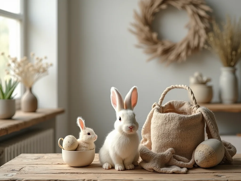- Enfeites de mesa com temática de coelhos em madeira ou cerâmica rústica.