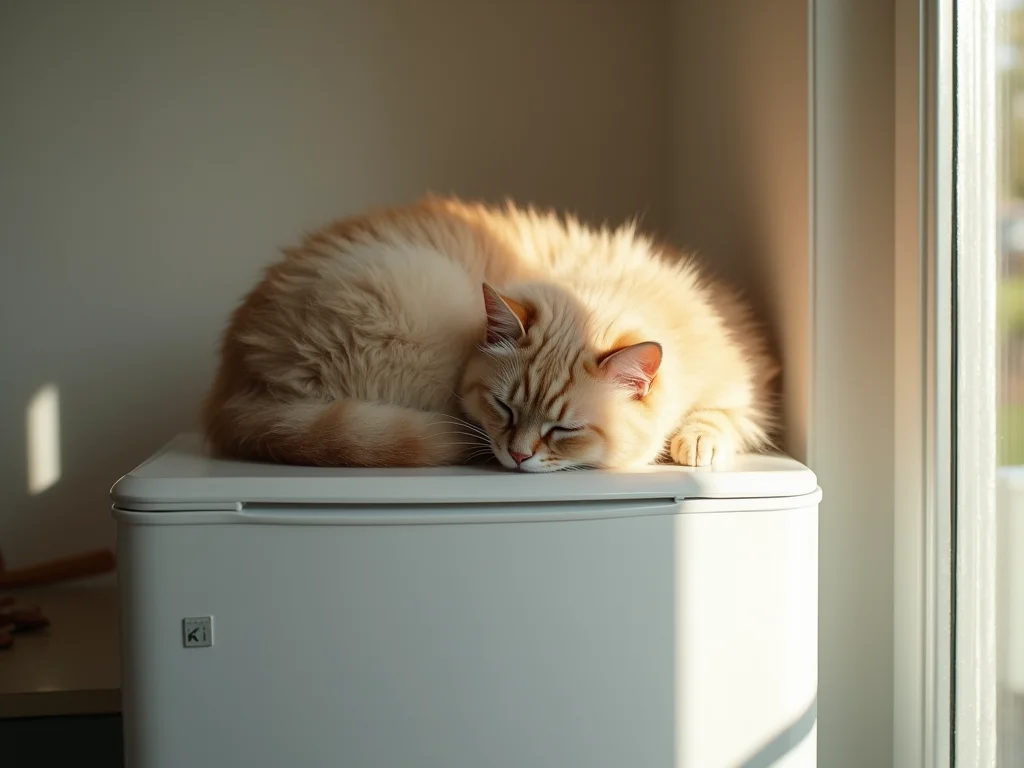 Olha só essa imagem! Gato dormindo em cima da geladeira. Para nós, pode parecer meio aleatório, mas para eles é um instinto poderoso. É a busca por um lugar alto, de onde podem observar tudo sem serem notados. Pensa comigo: em cima da geladeira, ele se sente o rei do castelo, seguro e com uma visão privilegiada do seu território.