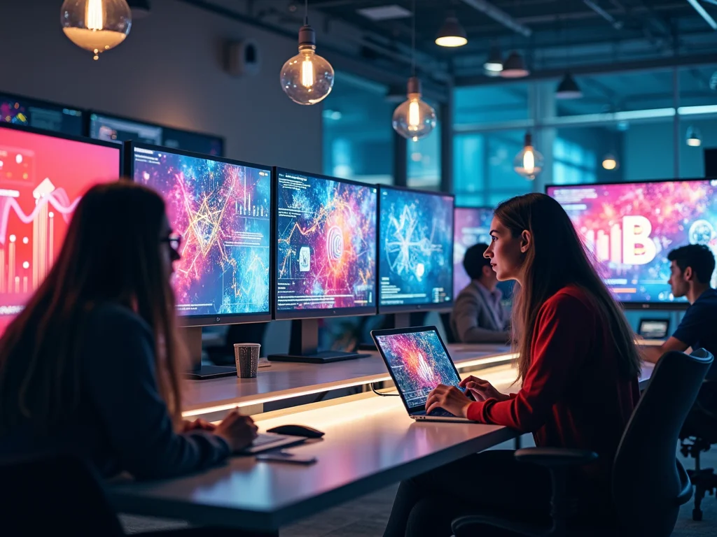 Um profissional de marketing digital revisando gráficos de desempenho em um monitor de computador com múltiplas telas, em um escritório minimalista com iluminação suave.