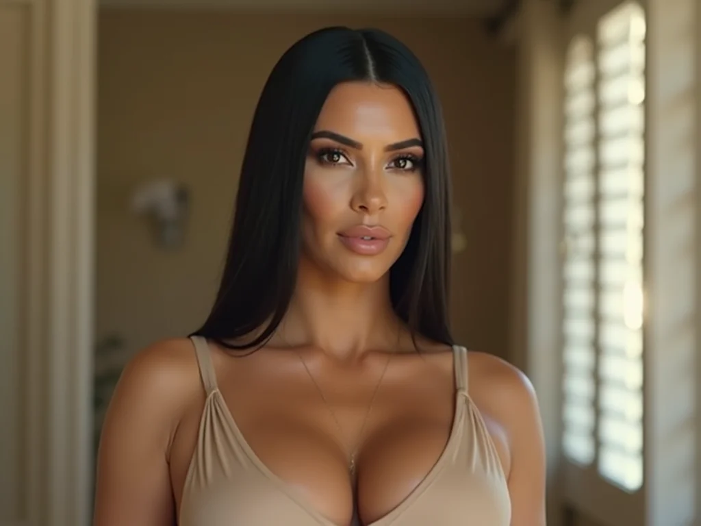 Kim Kardashian em uma sessão de fotos para a capa de revista, com iluminação de estúdio forte e um fundo com textura de tecido.