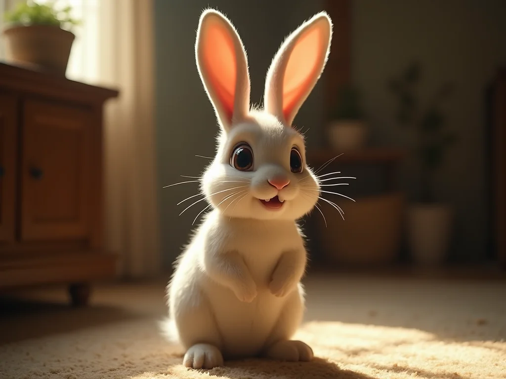 Close-up de um coelho branco com pelo macio e brilhante, orelhas eretas e um pequeno nariz rosa, em um ambiente com luz suave e desfocada.
