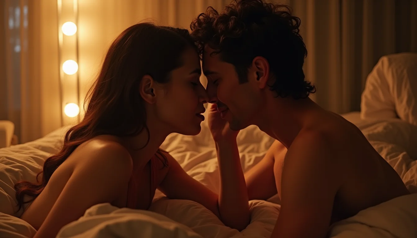 Iluminação indireta vinda de abajures laterais, criando sombras sutis que realçam as curvas dos corpos na posição 69.