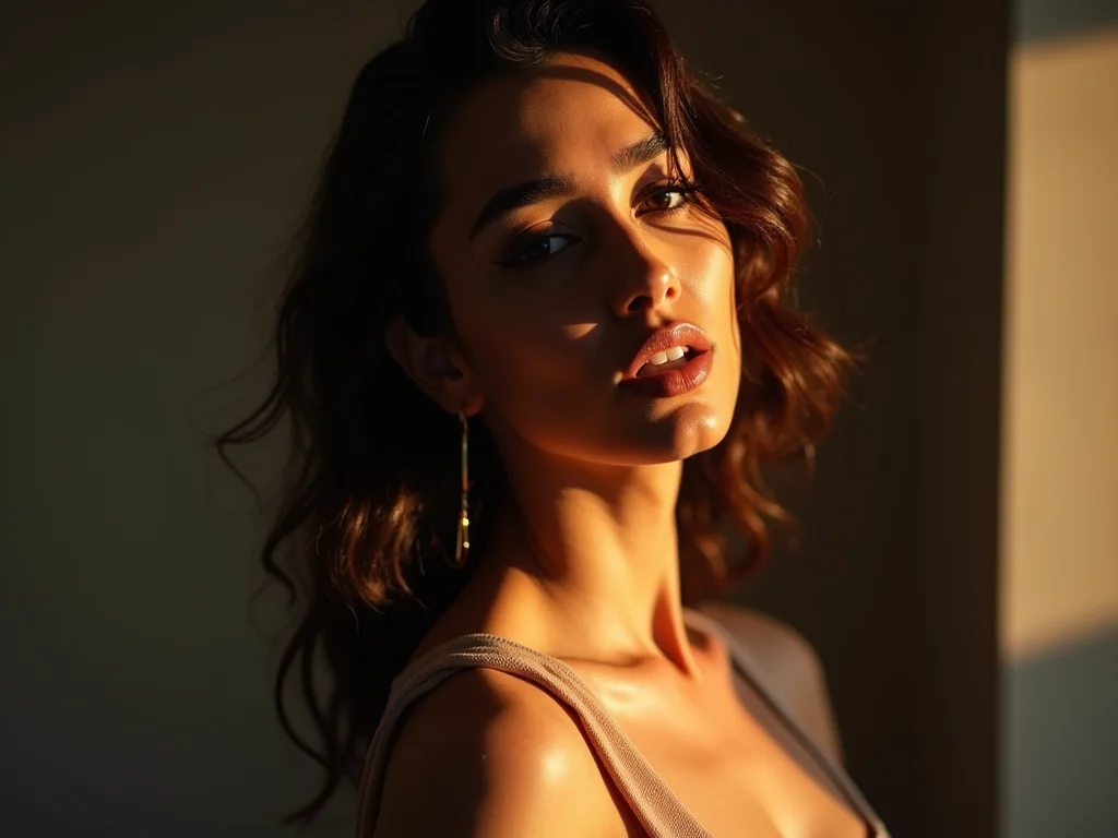 Imagem de Vanessa Alcântara em uma sessão de fotos, com iluminação de estúdio direcionada, realçando a textura de um tecido brilhante em seu vestuário e um fundo neutro em tons de cinza.